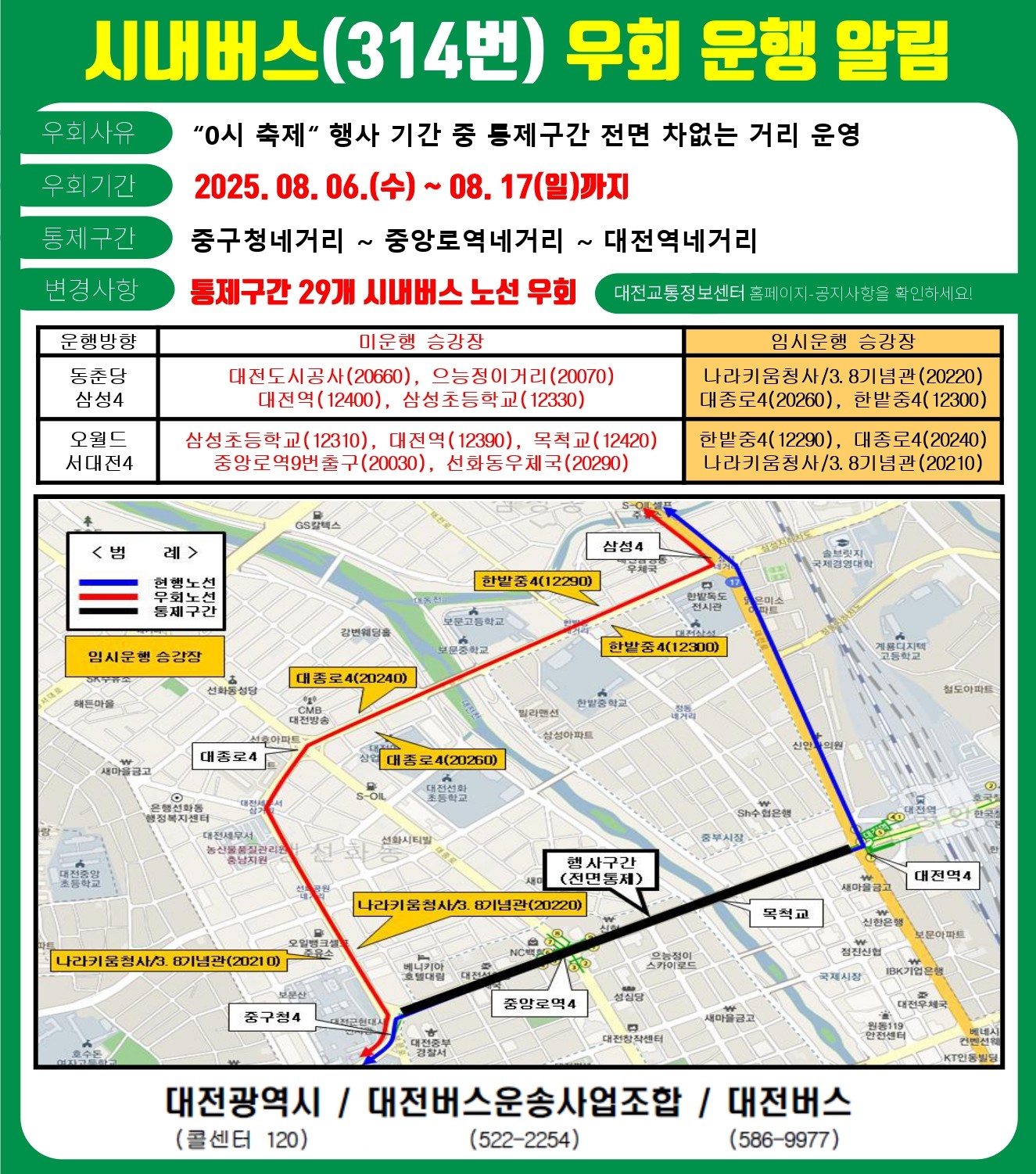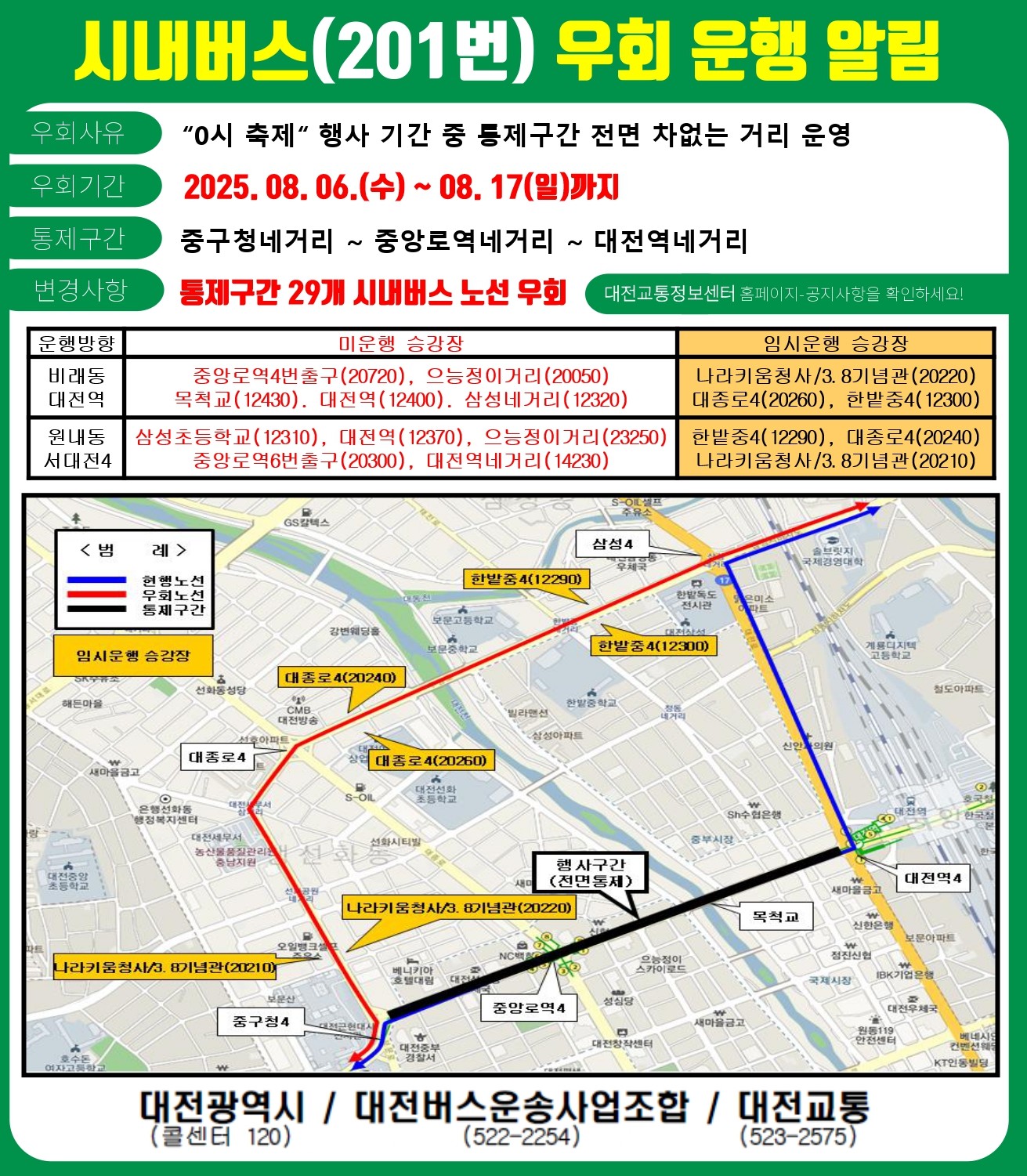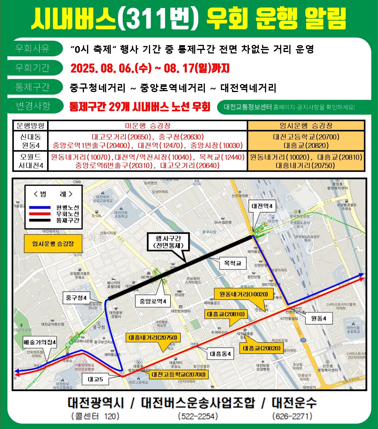 우회 운행으로 인한 소요시간 증가를 감안하여 평소보다 여유있게 출발하시고, 추가 문의는 대전광역시 콜센터 042-120으로 연락주시기 바랍니다.