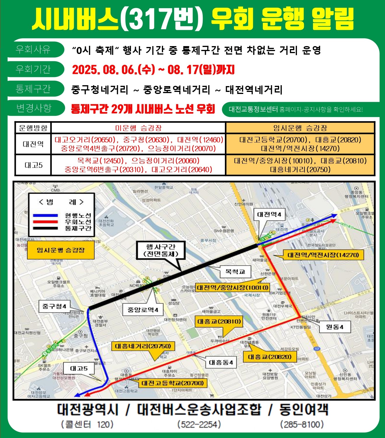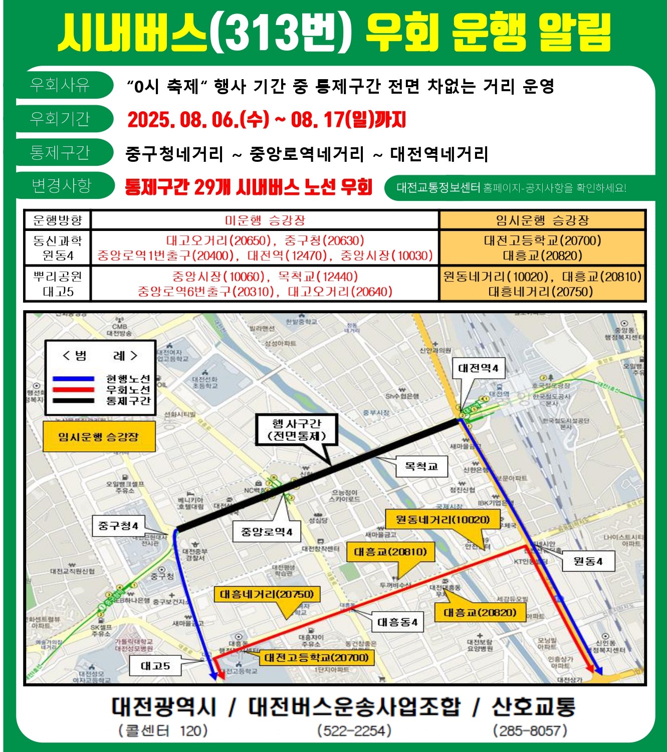 2025 대전0시축제 개최로 인해 201번, 311번, 313번, 314번, 317번 도시버스가 8월 6일(수) 첫차부터 8월 17일(일) 막차까지 우회 운행됩니다. 축제 구간인 중구청네거리 중앙로역네거리 대전역네거리 구간에서 차량 통제가 실시되어, 해당 노선들은 우암로, 대전로, 보문로, 대흥로를 경유하는 우회 경로로 변경됩니다.